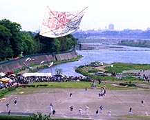 相模川河川敷で開催された大凧揚げ大会。 重量約700kgの大凧を空に揚げます。