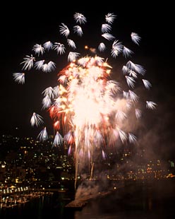音楽にあわせて打ち上げられる花火は、温泉街を美しく照らし出す。